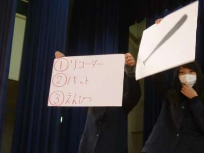 問題が進むにつれだんだん難しくなっていきました。最後の問題は、えんぴつのシルエットを見て、「何えんぴつでしょう?」という問題でした。最後まで楽しい雰囲気の中で活動することができました。