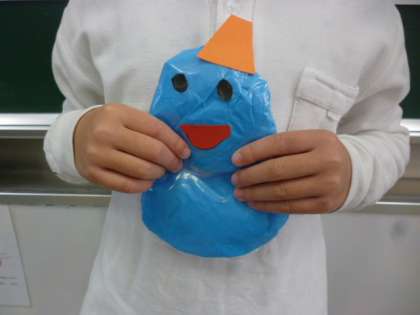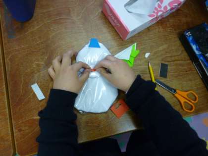 丸くなった頭と胴体の部分をビニール袋に入れて、両面テープで貼り合わせます。最後に、目、口、帽子をつけたら完成です。かわいい雪だるまがつぎつぎに出来上がりました。