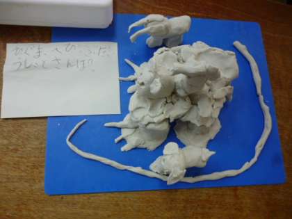 前回の取り組みで、片付けをする時、平然と粘土の作品を壊していたのですが、今回は、「ちょっともったいないな」「もっと続きをつくりたかった」という声が多く聞かれました。