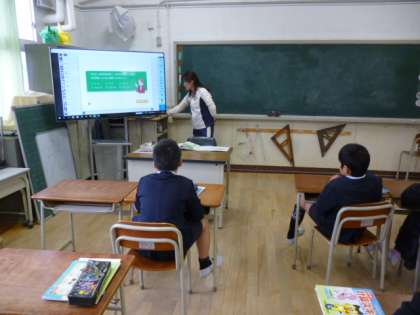 この教室には、電子黒板を常置しています(写真・上)。コンピュータを活用して、子どもの学習がスムーズに進むようにしています。