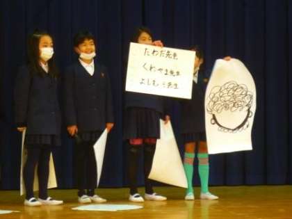 集会委員がかいたシルエットをもとに、答えを3拓の中から選ぶという内容でした。簡単な問題もあれば難しい問題もありました。1・6年のペアで相談しながら楽しく活動していました。