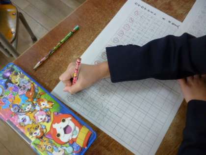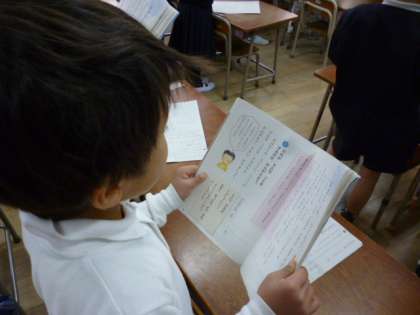 まず、学級全体で声を合わせて音読の学習をします(写真・上)。読む姿勢・声の大きさ・読む速さなどの習ったことを思い出しながら、音読をします。次に、すでに学習したいろいろな文字の小テストをします(写真・下)。この日は、カタカナです。答え合わせをして、忘れていた文字は、あいているところに3回練習します。