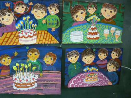 今回は、「島引き鬼」で身に付けた学習内容をもとに、絵画「マイ・ハッピー・バースディ」に取り組みました。