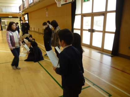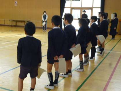 司会の担当の児童に、場所の確認をします(写真・上)。そこからは、司会者の言葉に従って、本番通りの式の流れで練習をしていきます。はじめは、寒かったからか、なかなか大きな声をだしにくかった子どもたちも、練習が進むにつれて、だんだん講堂が響く声がでてきました。