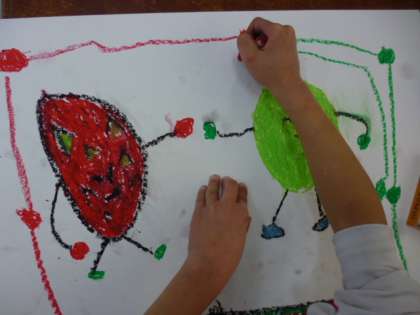 いよいよ、パスを持って描きはじめます。みんな、よほど待ち遠しかったのか、どんどん描き進めます。途中、パスを置き、自分の話を思い出し、情景を確かめるように考え込んでいる児童がいました。そっと見守っていると、また描きはじめました(写真・下)。