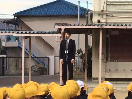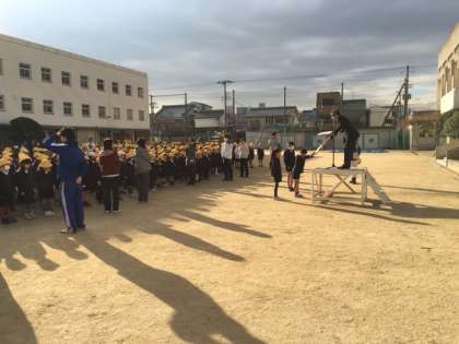 今日の児童朝会では、作品展の表彰と今日から1週間来られる実習生の土井惇平先生の紹介がありました。