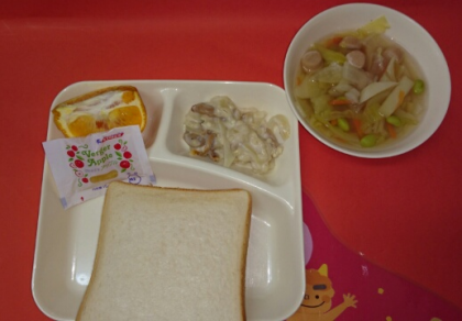 今日の食パンには、リンゴジャムがつきました。デコポンは1人1/4切です。