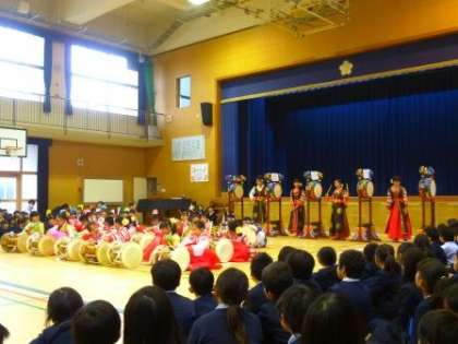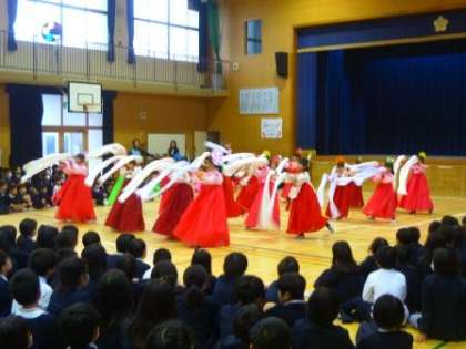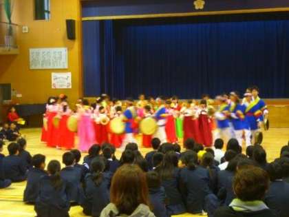 高学年の「チャンダン」に始まり、低学年の「タルチュム」。全学年で行った「プンムル」と、今までの練習の成果を存分に発揮することができました。保護者会からの「みんなで歌おう」では特別に民族衣装に着替えた先生もサプライズで登場するなど、大盛り上がりでした。