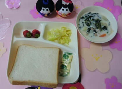 今日のパンは食パンでマーガリンがつきました。いちごは1人2コずつでした。