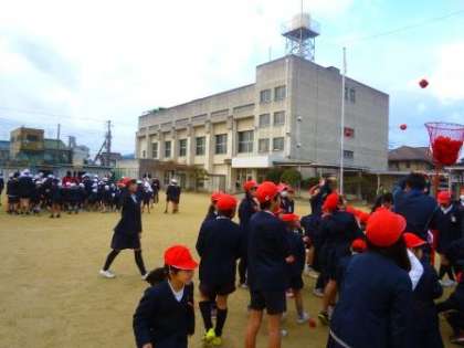 運動場で玉入れを行いました。赤チームと白チームに分かれて、玉を全部入れる速さで勝敗を競いました。結果は1回戦は白組。2回戦は赤組が勝利し、引き分けでした。