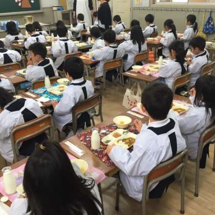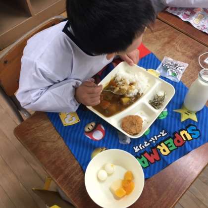 小学校初めての給食の様子です。メニューは子どもたちの大好きなカツカレーです。みんなおいしそうに食べています。