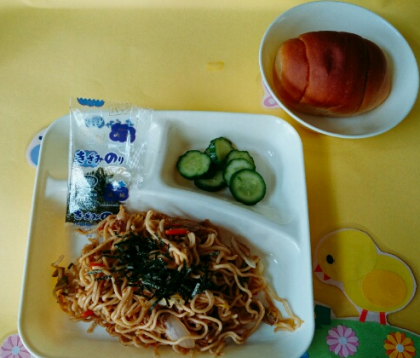 今日も、昨日に続き子どもに人気の焼きそばときゅうりのしょうがづけでした。焼きそばには、きざみのりが1人1袋つきました。きゅうりのしょうがづけは、塩ゆでしたきゅうりに、しょうが汁、砂糖、うすくちしょうゆのタレを熱いうちに和えて、味を含ませた1品になりこのきゅうりもこどもに人気です。