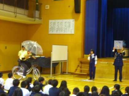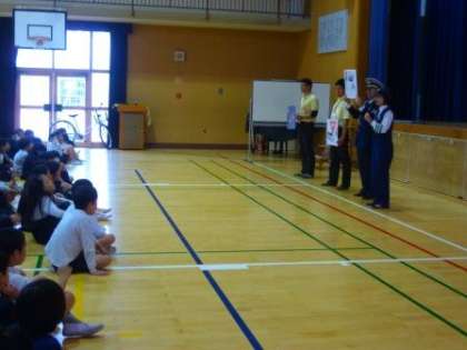 生野警察の方と地域まちづくり課の方を招き、2時間目に1・2年生。3時間目に5・6年生。4時間目に3・4年生と分かれて交通安全について学習しました。