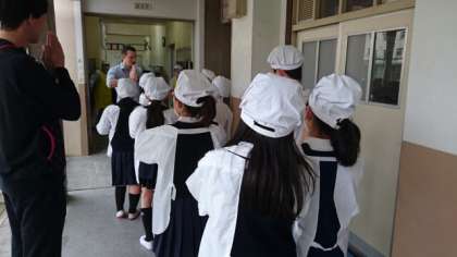 今日は給食の挨拶をC-NETのライアン先生にしていただきました。英語では「いただきます」と言う挨拶はありませんが、それに代わる「Let's Eat」と教えていただき皆で言っていました。