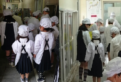 1年1組さんは、昨日から給食を6年生のお兄さんお姉さんと一緒に取りにいっています。準備も挨拶も自分達でしています。