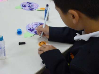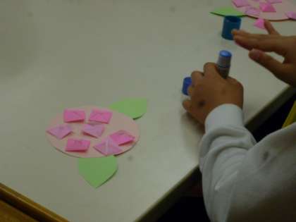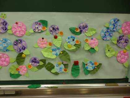 今日のあゆみの時間は、6月に向けて「あじさい」を作りました。おりがみを8枚折り、台紙に貼っていきました。そして、かたつむりの甲羅と表情を描いてあじさいに貼り、葉っぱをたくさん作りました。