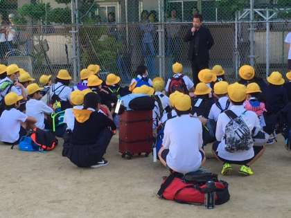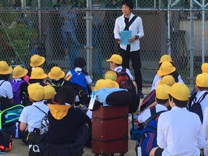 6年生修学旅行の出発式です。白浜方面に向けて出発しました。おうちの方々もたくさん見送りに来てくださいました。