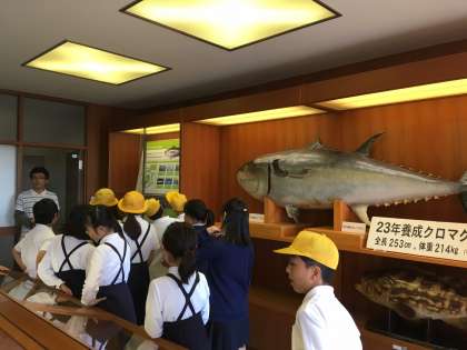 32年かけて成功した クロマグロの完全養殖について、また23年養成クロマグロの剥製を見ながらその生態について学習しているところです。