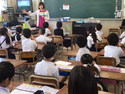 金曜の朝は全校イングリッシュタイムから始まります。映像や音声、カードを活用しながら、楽しく英語を学習します。