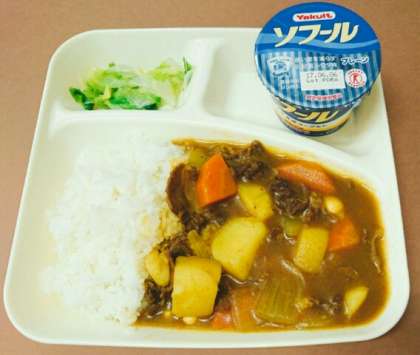 今日は大人気のカレーでした。カレーの中には大豆が入っていましたが、豆が苦手な子どもでも気にすることなく食べていました。おかわりまでして完食していました。