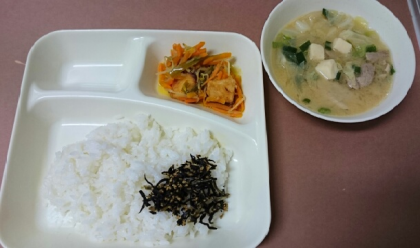 まぜまぜふりかけは、ひじきとだいこん葉を砂糖・みりん・しょうゆで味つけし、いりごまを加えたふりかけでみんな食べやすかったようでご飯も良くたべていました。