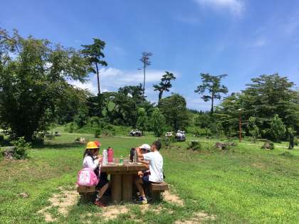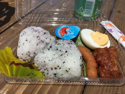 キャンプ場にて、昼食のお弁当タイム、、、グループごとに仲よく食べています。