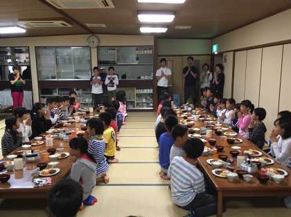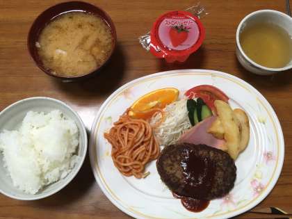 食事は、生活班ごとに3日間同じ席でいただきます。今日の夕食のメニューは、ハンバーグ定食です。