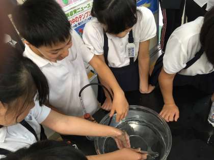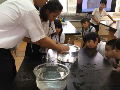 炭酸水から出る気体を 水で満たした試験管に集めているところです。
