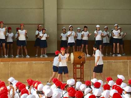 運動会に向けて、応援団を中心に紅白応援合戦の練習をしました。和太鼓に合わせ、元気いっぱい声を出していました。