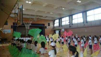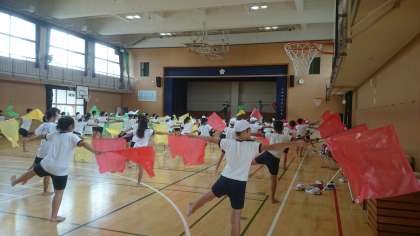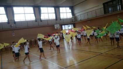 1曲目の楽しい「ダンス」2曲目の力強い「組体操」の練習が終わり、3曲目の「フラッグ」を使った練習です。息をそろえてきれいにふることの練習中です。