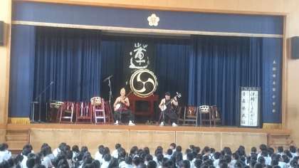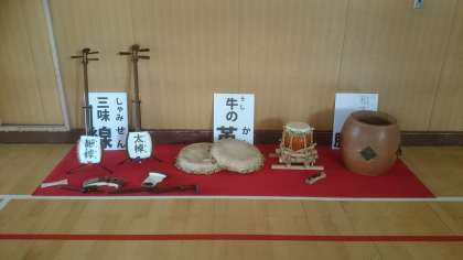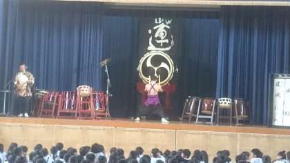 和太鼓や三味線、篠笛で力強いリズム、すばらしい音色を聴くことができました。プログラムの中には、楽器の紹介がありました。鑑賞会後に実際に楽器にさわることもできました。
