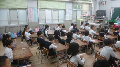 今日は雨のため、放送で朝会を行いました。どの学級も静かに話を聞くことができていました。