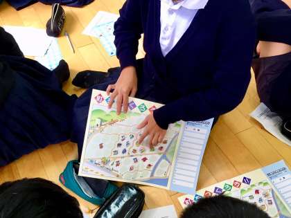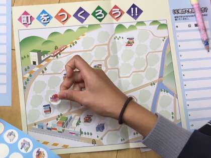 「町をつくろう」という ワークシートに、「お年寄りにやさしいまち」や「子どもが増えるまち」をイメージして、必要なものは何か考えているところです。