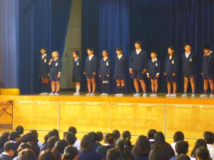 今朝の児童集会の様子です。後期代表委員の児童が自己紹介をしました。舞台の上でそれぞれどのような学校にしたいのかという決意を立派に発表しました。