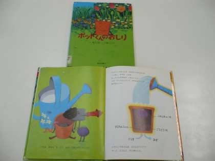 ポットくんは素焼きの植木鉢。おしり(鉢底)にあながあいていることを気にしています。「おしりに あな あいてますか?」とジョウロさんやミミズくんに聞いてまわる途中、迷子になって泣いている球根のヒヤシンスちゃんに出会います。楽しく読むうちに植木鉢のつくりやしくみ、ミミズのはたらきまで学習できる絵本です。