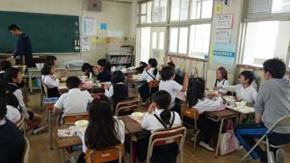 3年1組の給食時間の様子です。今日は、年に1回のたこボール!おかずはほとんど完食しました。