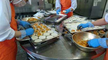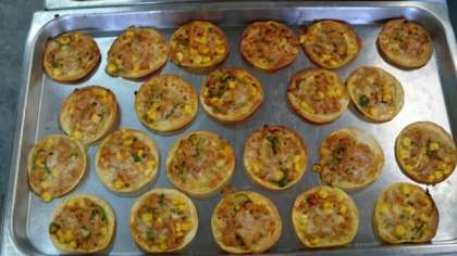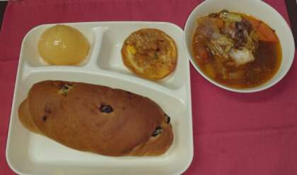 今日のパンはレーズンパンでした。変わりピザはツナ・コーン・ピーマン・チーズ・ピザソースを混ぜ餃子の皮にのせて焼き上げました。児童にも大好評の1品です。
