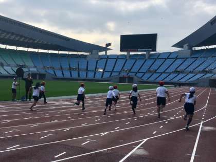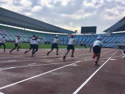 全員でストレッチをした後、100m走を各校コースに分かれて走りました。