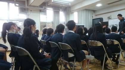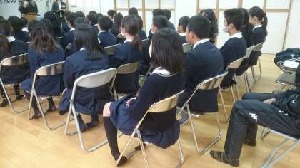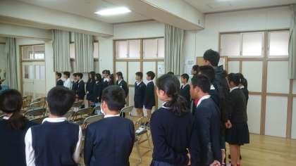 劇団四季の方を招いて行った『美しい日本語の話し方教室』の様子です。音の分離、母音と子音等、日本語における母音の重要性について教えていただきました。最後に学習したことをいかして「友だちはいいもんだ」をみんなで思いや気持ちが伝わるように歌いました。