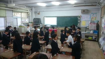 2枚目は5年生の様子です。英語の物語を聞いて先生の質問に答える活動をしました。