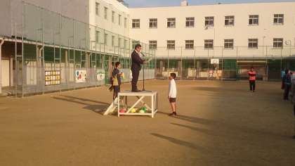 まず、夏休みの『消防の図画』において優秀な作品を出品した児童の表彰がありました。次に、児童会から『募金活動(赤い羽根募金)』についての連絡がありました。募金は明日12日(火)〜14日(木)の朝の登校時間に玄関で行います。ご協力よろしくお願いします。