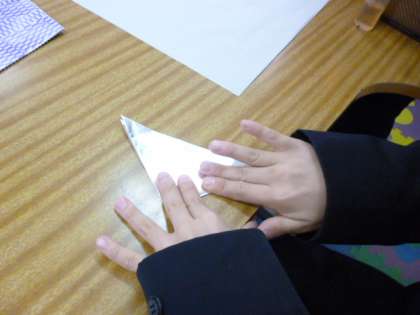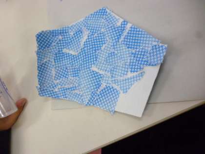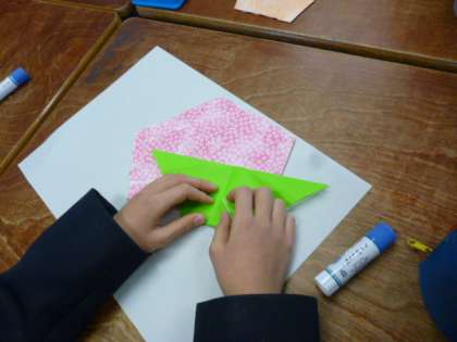 1月の掲示を制作しました。和紙をちぎって絵馬にはりつけました。戌年なので、折り紙で犬も折りました。来週完成させます。