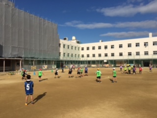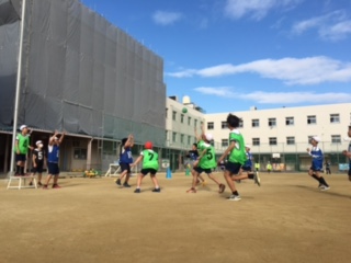 ポートボールの学習です。素早くパスを出したり、相手をかわしてシュートを決めたりして、ゲームを楽しみました。審判役の児童もいて、自分たちでゲームを進めることができました。