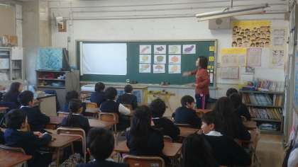 いつも通り、単語の発音の練習に取り組みました。しっかり聞いて、発音する学年もあれば、ジェスチャーを交えて行う学年もありました。活動の仕方は学年によって違いますが、どの学年もそれぞれの形で英語に親しむことができました。