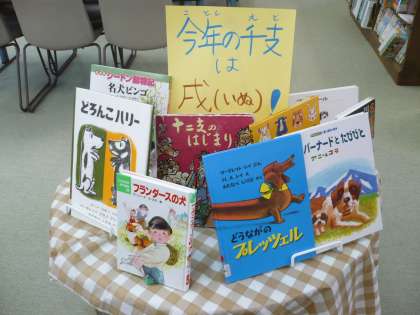 新年を迎え、図書館では戌年にちなんで「犬が登場する本」を集めて展示しています。たくさんの子どもたちが手にとってくれています。