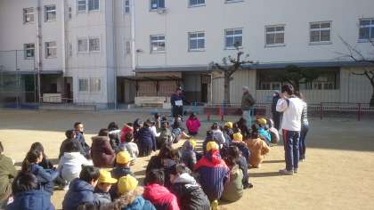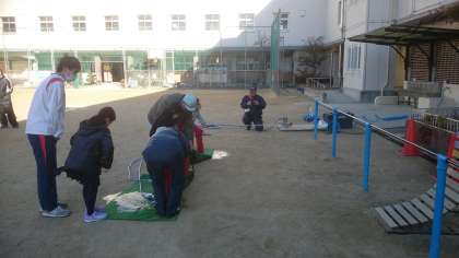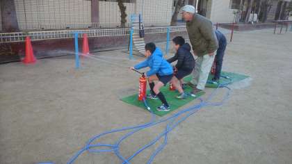 4年生は運動場で、消火器体験を行いました。