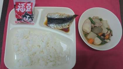 きょうは、節分の行事献立でした。学校給食ではいわしの開きを料理酒で下味をつけ焼き上げ、しょうが汁・砂糖・みりん・しょうゆの合わせタレをかけています。少し甘味のあるタレで児童にも大好評でした。