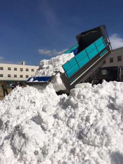 10トントラック3台分の雪が巽小学校にやってきました。12:00からは雪まつりが行われます。