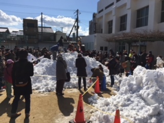 たつみ雪まつりの様子です。雪山によじ登ったり、雪だんごをつくったりして、子どもたちは大はしゃぎでした。冬の素敵な思い出ができました。山口区長様も来てくださいました。雪まつり実行委員の並びに地域の皆様、ありがとうございました。