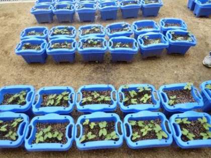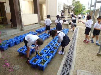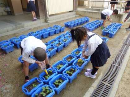 1年生のあさがおの双葉がたくさん出てきました。毎朝、水やりをしています。